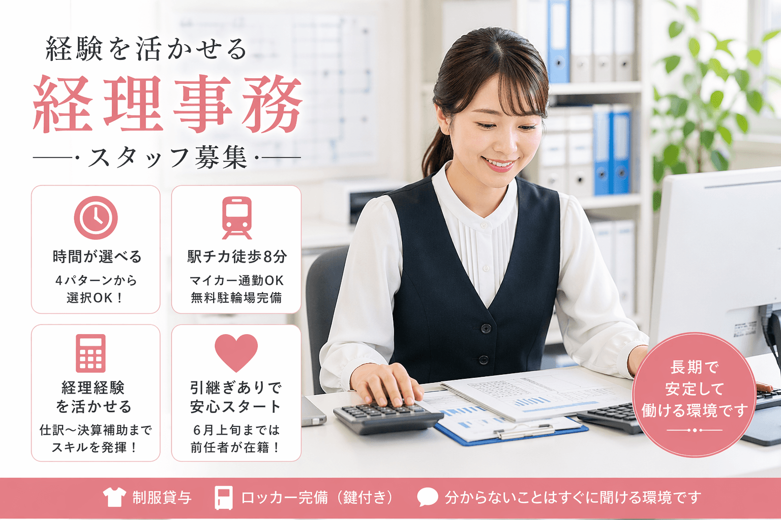 ✔ 勤務時間が選べて働きやすい ✔ 引継ぎありで安心スタート ✔ 経理スキルを活かしてしっかり稼げる ✔ 落ち着いた職場で長く働ける