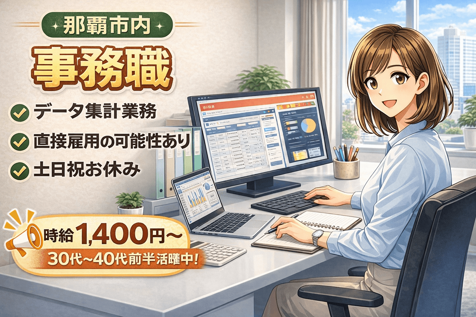 【那覇市久茂地】時給1,400円!事務職/土日祝休み/直接雇用のチャンスもあり☆/(oki157)