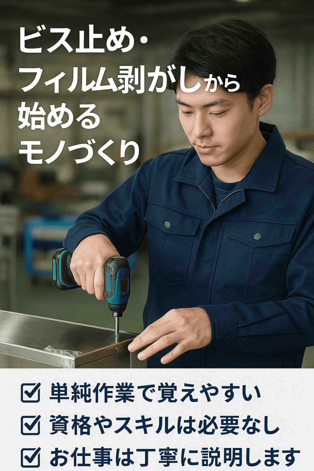 フィルムをはがしたり、ビスをとめたりのモクモク系の単純作業! 未経験でも工具の使い方からマンツーマンで丁寧な指導あり◎ 「前職は飲食・販売」など異業種から入社した先輩も多数活躍中です! 土日祝休み×大型連休も充実! 更衣室・食事スペース・鍵付きロッカーあり 安定した環境で長く勤務することができるのも魅力です 事前の職場見学もOK!先ずはお気軽にお問い合わせください