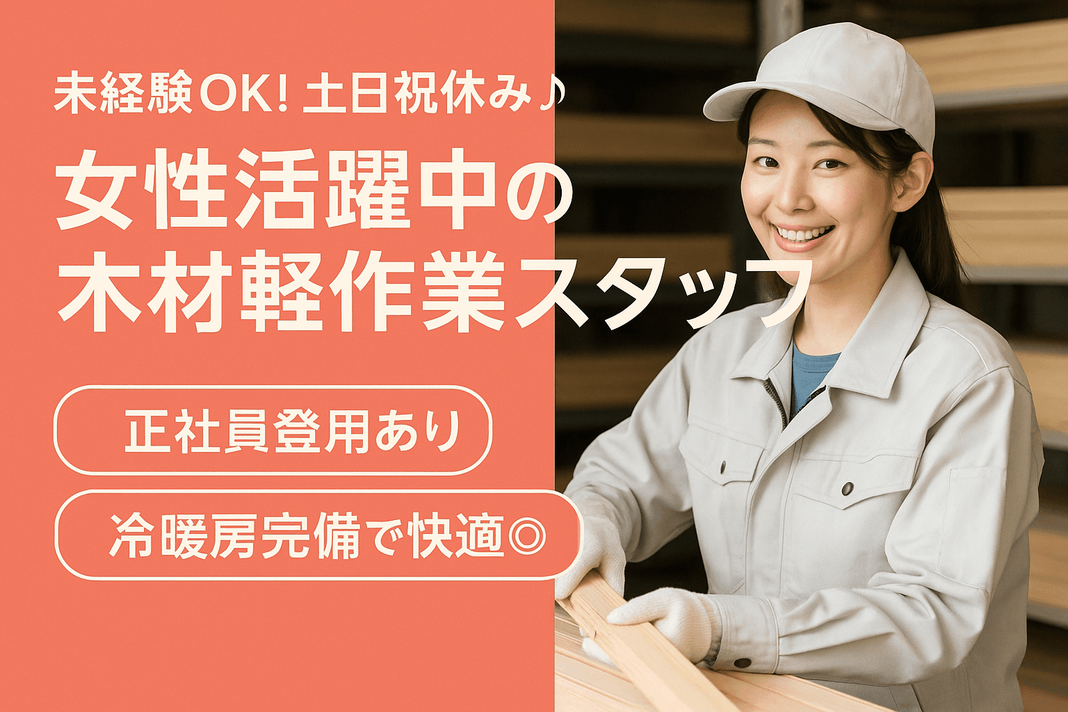 ✅20~30代の女性スタッフ活躍中 ✅重量物なしで女性も安心 ✅ 丁寧な研修&フォロー体制あり ✅ 正社員登用ありで長く働ける ✅冷暖房完備で快適環境 「コツコツ作業が好き」「安定して長く働きたい」 そんな方にピッタリ! 木材製品の検品・梱包・加工などの軽作業スタッフを募集しています。 扱う部品は軽量で、未経験からスタートした女性スタッフも多数♪ 冷暖房完備のきれいな職場で、マイペースにモクモクと働けます。