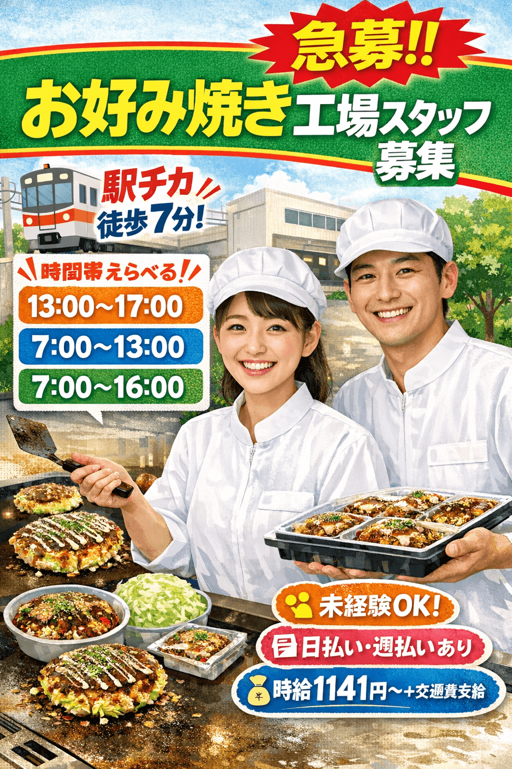 \お好み焼きの製造補助のお仕事です/ ○生地の調理 ○野菜のカット ○盛り付け ○梱包作業 など どれもシンプル作業でラクラク♪ コツコツ・もくもく作業が好きな方 家庭と両立したい方におすすめです✨