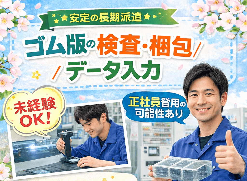 基板印刷に使う「ゴム版」の検査・梱包と、データ入力のお仕事です! ▼具体的には… 🔹 ゴム版の厚さチェック 🔹 異物混入がないか機械で確認 🔹 数字などのチェック作業 🔹 梱包作業 🔹 在庫管理表・注文書へのフォーマット入力 (決まった形式に入力するだけなので安心!) 👉 やっていけば自然に覚えられる内容です◎