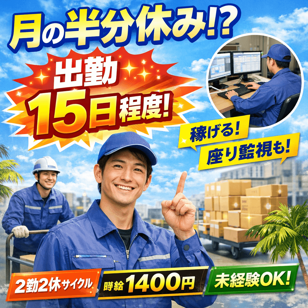 *時給1,400円+交代制でしっかり稼げる! *交代制サイクルが「2勤2休・3勤2休・2勤3休」なので休み多め◎ ➡ 月の出勤は約15日程度!プライベート重視派にもおすすめ♪ *班ごとのチーム作業(5人程度)で未経験でも安心 *原料投入・運搬は台車を使用するので負担が少なめ *別室でのPC監視業務あり(座り作業)でメリハリ◎ *お弁当注文OKで食事の心配なし! *GW・お盆・年末年始は連休ありでしっかり休める *長期派遣で安定して働ける