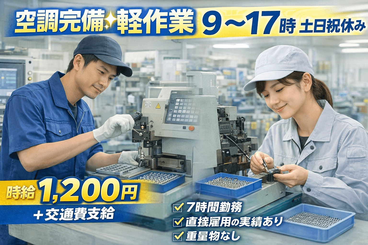 ✅ 空調完備で快適 ✅ 重量物なしで体の負担少なめ ✅ 7時間勤務で働きやすい ✅ 土日祝休みでプライベート充実 ✅ 直接雇用のチャンスあり