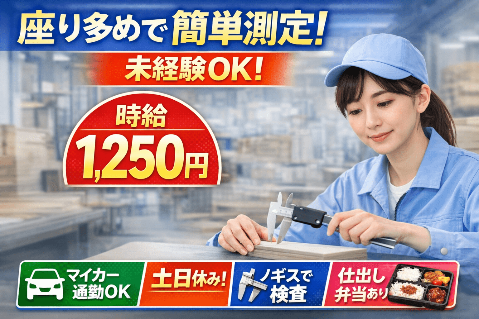 コツコツ作業が好きな方にピッタリ! 重たい物なし◎測ってチェックするだけの品質検査✨ 落ち着いた環境で長期安定して働けます♪ ✅ 軽量製品で体の負担少なめ ✅ ノギスの使い方は丁寧に指導あり ✅ 土日休み+大型連休あり ✅ 時間帯が選べる(日勤固定) ✅ 車通勤OK・無料駐車場完備 ✅ 仕出し弁当あり(1食420円) ✅ 長期安定の品質保証ポジション