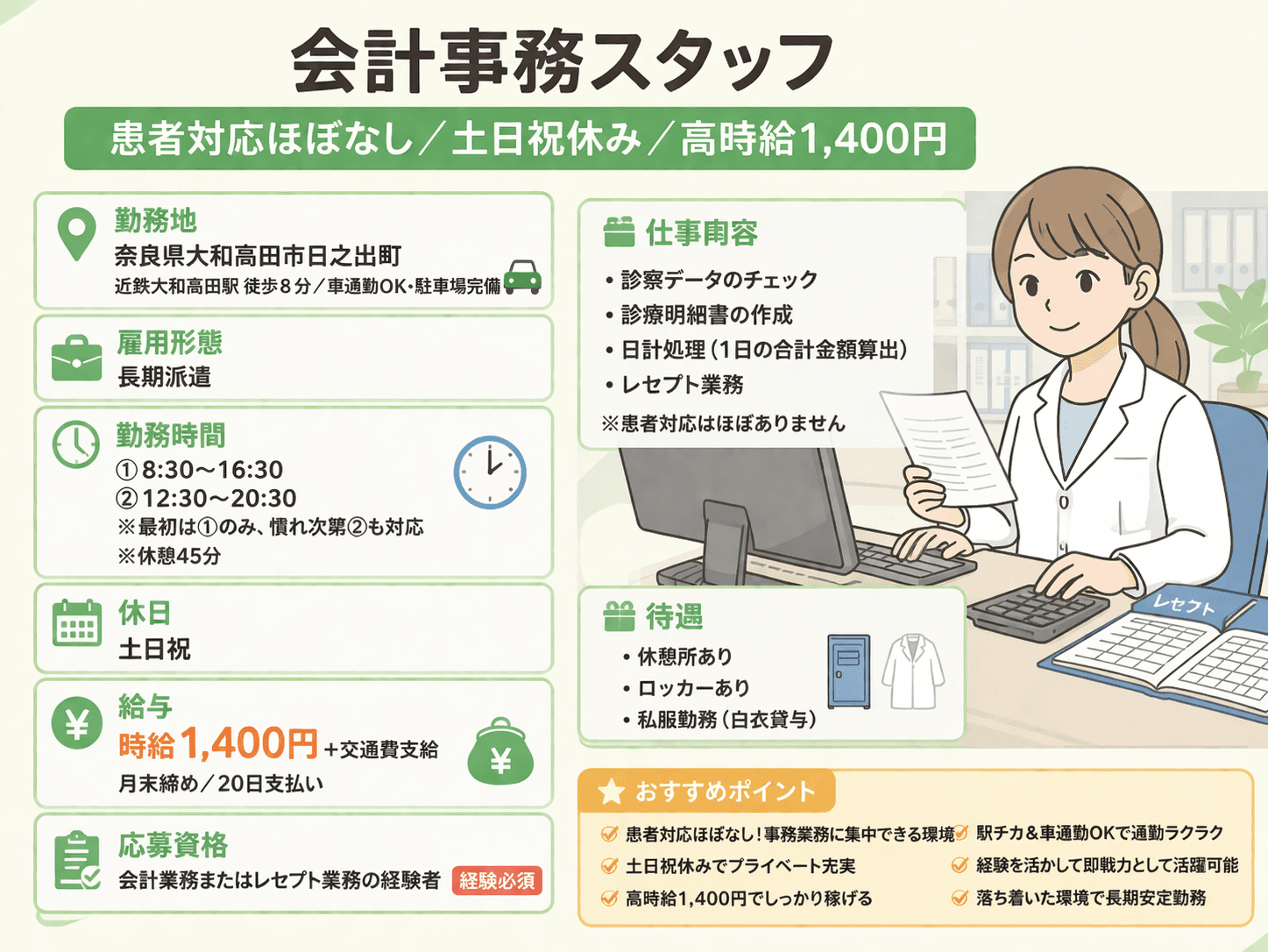 【お昼からの会計事務スタッフ】患者対応ほぼなし/高時給1,400円 [nara-k40]