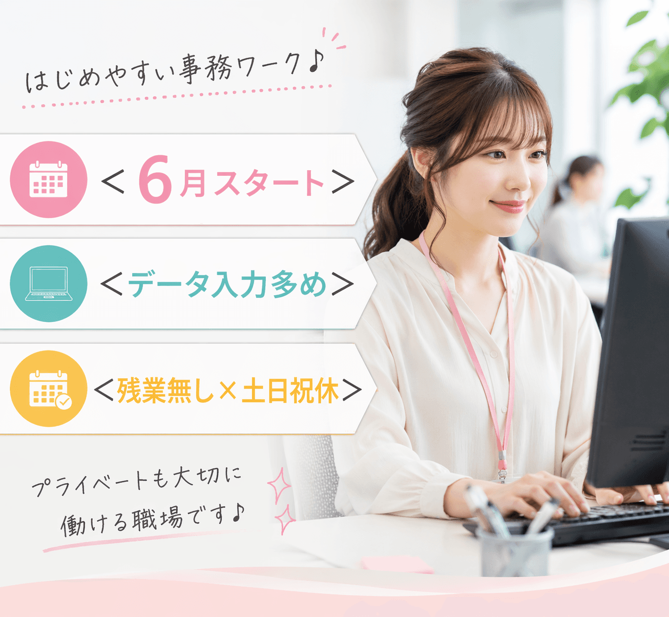 > 6月開始の事務ワーク♪経理スキルは不問! < ▼データ入力がメインです!!!▼ ・売上、経費入力 ・締め作業 ・振り込み ・切手管理 など 事務経験があればスグ慣れる◎ 経理知識が無くても出来る作業!