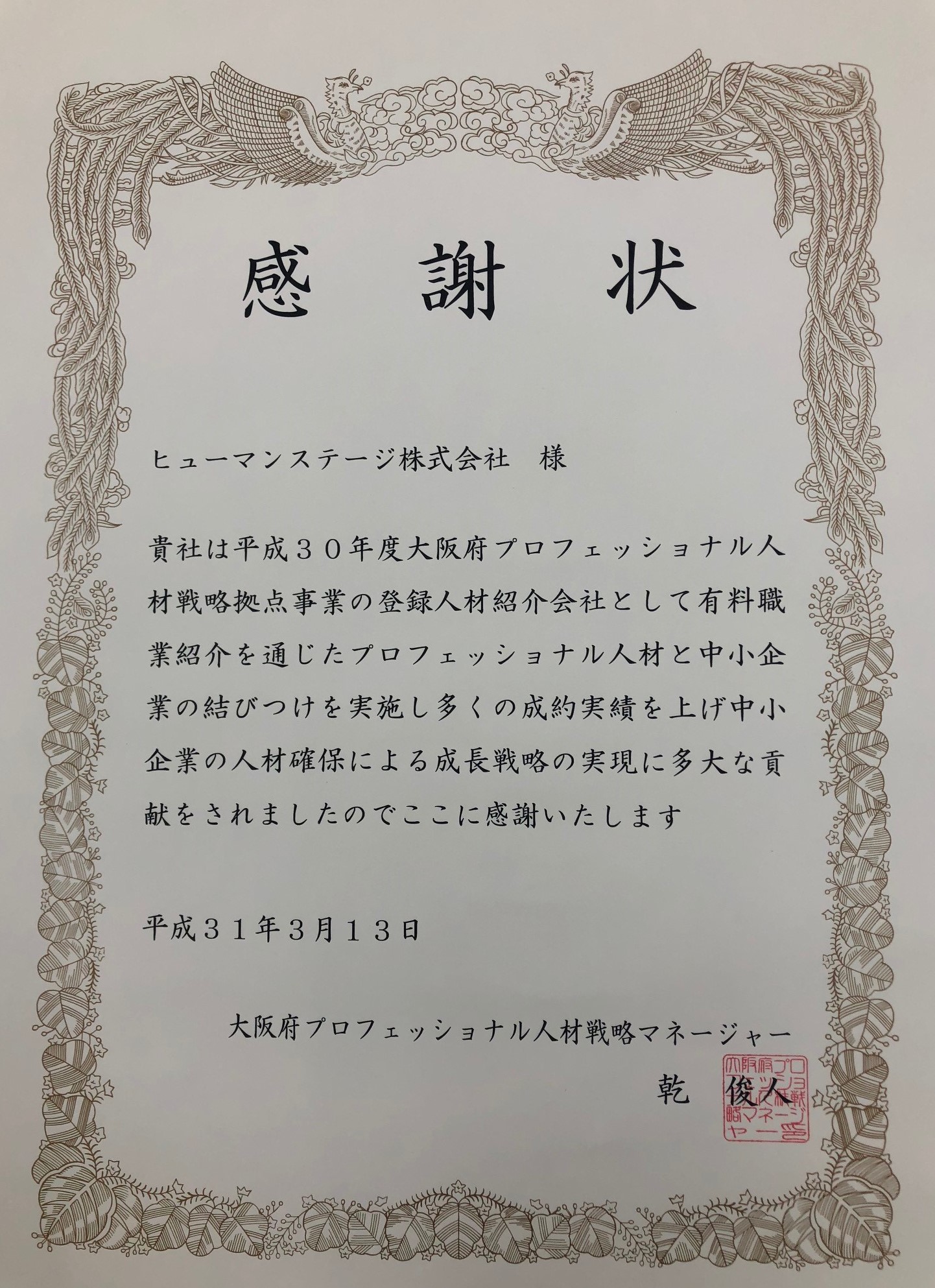 プロフェッショナル人材戦略事業に寄与し、大阪府より感謝状を頂きました。
