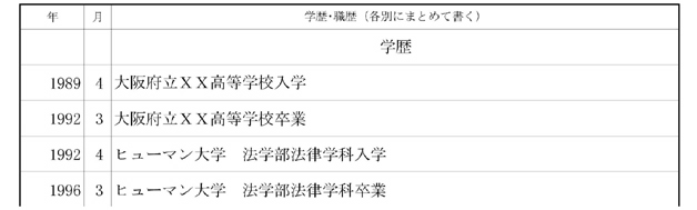 一行目の中央に「学歴」と記載して、2行目から高校名、大学名を記入するようにします。大学は学部、学科まで記述し、最終学歴の卒業で終わるようにしてください。もし、学校名が変更されている場合は、現在の名称を( )内に記入してください。