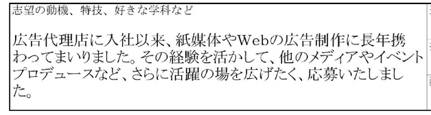 経験者の場合、クリエイティブ能力のほかに、企画力、プロデュース能力なども問われることが多いです。そのなかでも特に自分が得意とする分野も明確にしておきたいところです。企画提案して実現させたもの、得意な分野に関する知識を、具体的に記載しよう。納期やクライアントの要望など、柔軟な対応能力も必要とされるため、最後までやりぬく熱意や責任感も求められます。