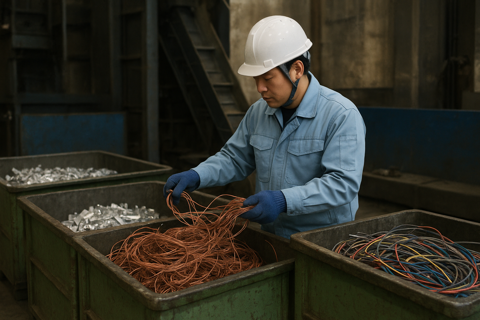 ・・・・ベルトコンベアで流れてくる粉砕されたものを(鉄)(アルミ)(銅)(プラスチック)に仕分けする作業