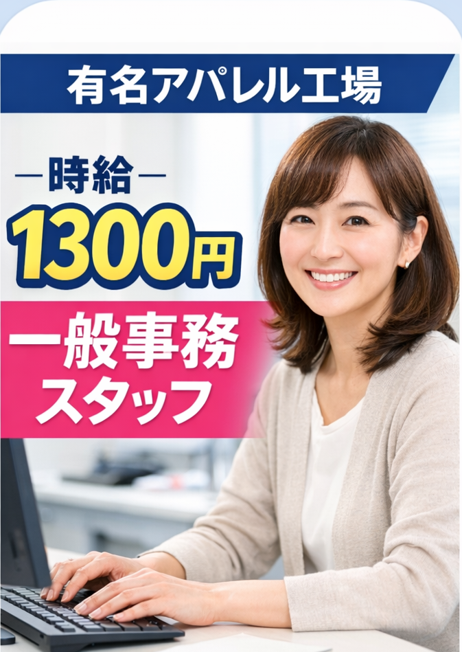 時給1300円|50代歓迎|有名アパレル工場の一般事務|土日休み・服装自由/近鉄「福神」駅徒歩10分[nara-s31]
